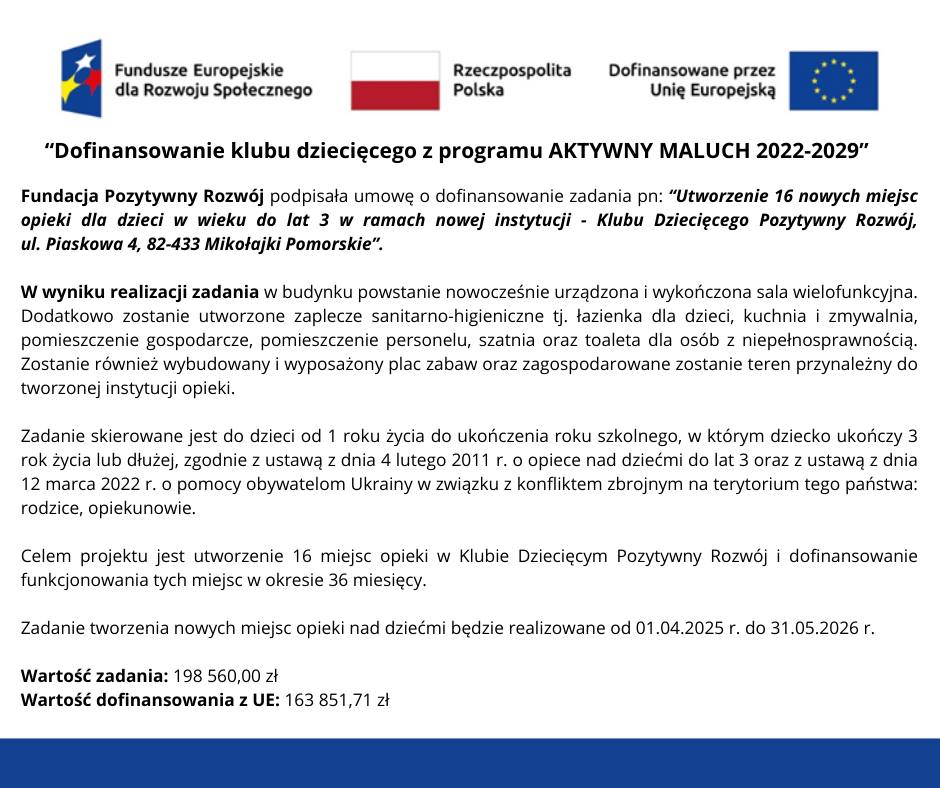 Nasz klub dziecięcy powstaje dzięki dofinansowaniu z programu „Aktywny Maluch 2022-2029”. Jesteśmy dumni, że możemy stworzyć tę placówkę na terenie gminy Mikołajki Pomorskie, odpowiadając na realne potrzeby lokalnej społeczności i wspierając rodziców w godzeniu życia zawodowego z rodzinnym.